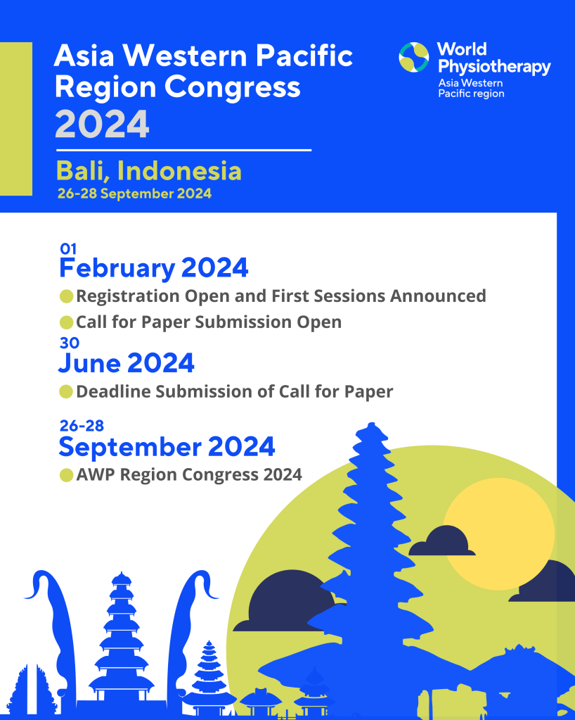 Hợp tác và chuyển đổi theo hướng thực hành vật lý trị liệu bền vững là chủ đề của Đại hội Vật lý trị liệu Thế giới khu vực Châu Á – Tây Thái Bình Dương (World Physiotherapy Asia Western Pacific Region Congress 2024) sẽ được diễn ra từ ngày 26-28 tháng 9 năm 2024, tại Bali, Indonesia.